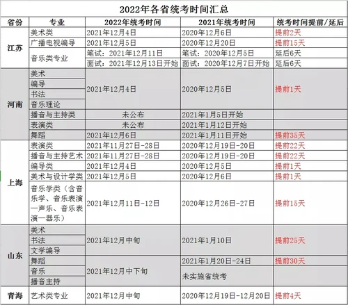 全国已有上海、江苏、河南、山东、青海等5个省份公布了2022年艺术类专业统考时间。值得注意的是,各省绝大多数艺术类专业统考时间均提前。