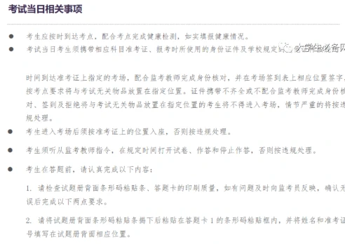 考试当日考生须携带相应科目准考证、报考时所使用的身份证件及学校规定的其他证件按规定时间到达准考证上指定的考场,配合监考教师完成身份核对,并在考场签到表上相应位置签字,按考点要求将与考试无关物品放置在指定位置。