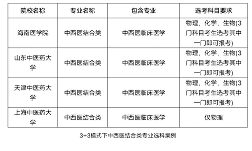 在3+1+2模式下,大部分院校的中西医结合类专业对首选科目无要求,选物理或历史均可,如华北理工大学、河北医科大学、辽宁中医药大学等;少部分院校的中西医结合类专业要求首选科目为物理,如长春中医药大学、江西中医药大学、华中科技大学等。