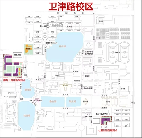 研究生迎新期间,北洋园校区共设置4个接待站,分别为新建宿舍区(25-26斋)、知园(4-5斋)、平园(21-24斋)、齐园(13-16斋)。卫津路校区共设置2个迎新接待站,分别为六里台宿舍区(32-46斋)、七里台宿舍区(47-53斋)。