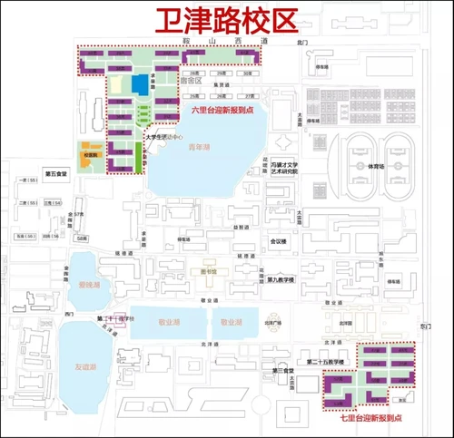 迎新期间,学校将在天津站、天津西站、天津南站、天津机场设立迎新接待站,安排车辆运送新生前往卫津路校区和北洋园校区。