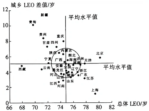 下图示意2010年我国各省LED(预期寿命)数值以及城乡LED差值情况。据此完成下面小题。