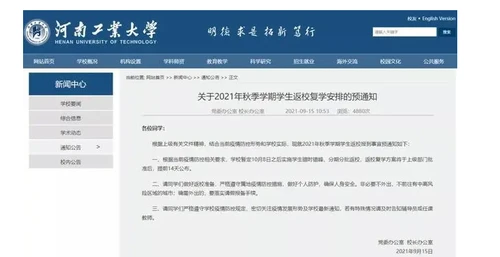 河南工业大学也是公布了学生们的返校安排,学生们也都是进行着错峰返校,分批次的返校,暂定在10月8日之后开始着分批次返校,也是要求着现在的学生们是提前14天要求着健康打卡。