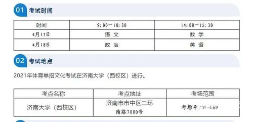 从省招考院获悉,2021年体育单招文化考试将在济南大学(西校区)进行,考试时间为4月17日—18日,考生需在4月10日12:00后登录“体育单招报名系统”自行打印准考证。