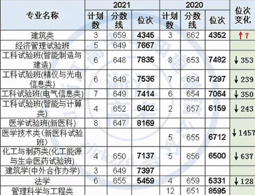 专业的位次变化情况来看,除了建筑类专业有很小浮动的上升外,其余都有所下降,特别是医学试验班(新医科)专业下降了1457名。