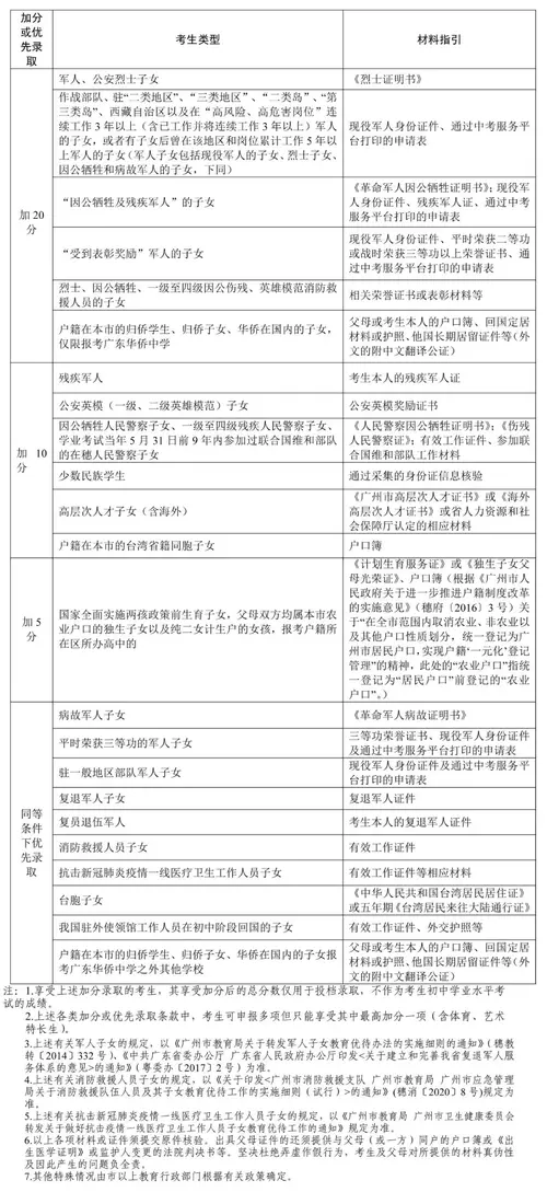 2021年广州市高中阶段学校考试招生加分或优先录取考生分类见下表:
