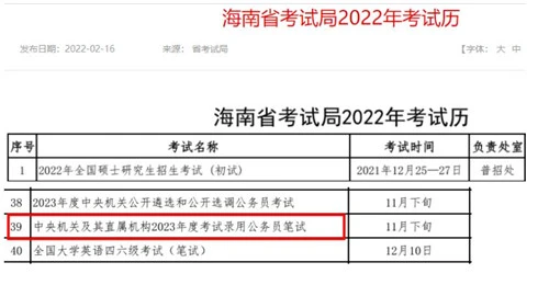 2022年国考笔试已经结束,遗憾错过的考生们别着急,2023年国考笔试时间有消息啦。海南省考试局近期发布了《海南省考试局2022年考试历》。其中也明确表示2023年国考笔试时间为11月下旬,下面小编在这里为大家精心整理了2023年国考考试时间安排表,有需要的同学们,可以参考一下,下面就来具体了解一下吧。