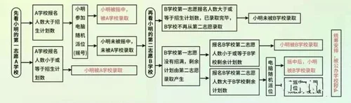 7月16日:摇号,学生先参加第一志愿学校摇号,如果没中,且第二志愿学校没招满的,则被第二志愿学校录取。