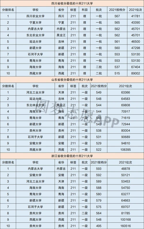 小编以2021年全国211大学在四川省、山东省、浙江省三省的收分为例,看一看收分最低的十所211大学是哪十所,它们的收分是多少?