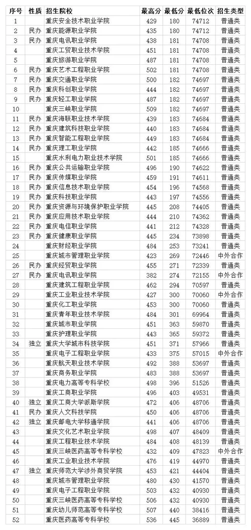 重庆市内设置有专科批次的院校,一般民办院校录取线相对较低,大部分最低投档线都在200分有以下,文科类相对投档线偏高一点。