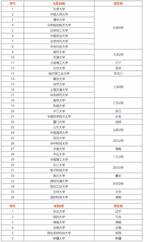A类:北京8所,天津2所,辽宁1所,吉林1所,黑龙江1所,上海4所,江苏2所,浙江1所,安徽1所,福建1所,山东2所,湖北2所,湖南2所,广东2所,四川2所,重庆1所,陕西2所,甘肃1所。
