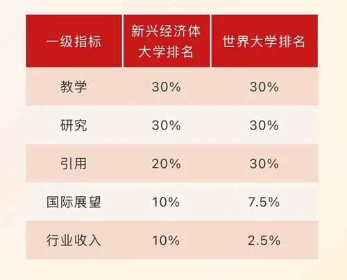 下图是这个新兴经济体大学排名的指标,教学占30%,研究占30%,引用占20%,国际展望占10%,行业收入占10%。这个指标体系是一种值得参考的体系,却未必一定准确,这一点咱们心知肚明。