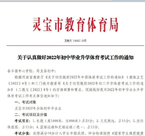 根据河南省教育厅《关于切实做好2022年中招体育考试工作的通知》(教体卫艺〔2022〕4号)和三门峡市教育局《关于切实做好2022年初三升学体育考试工作的通知》(三教文〔2022〕8号)的安排部署和要求,现就做好灵宝市2022年初中毕业生升学体育考试工作有关事宜通知如下: