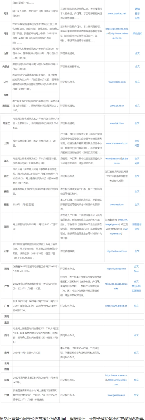 注:以下表格为各省份2021年高考补报名时间,并非2022年高考补报名实际时间,2022年的高考补报名时间还有待各省考试院官方通知。