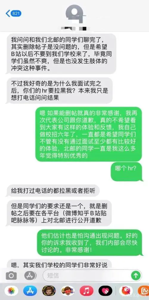“因为该同学没有通过面试,网络平台也上出现了一些攻击性言论,HR在凌晨两点回拨过该同学电话,主要在安抚他的情绪。通话我们进行了录音,录音可以进行公证。”“这是2点的时候,通话后该学生主动跟HR发来的短信,电话中并没有提删帖,学生自己主动提及的删帖。后来我们这段聊天被部分截取放到了网上,看上去像是HR要求他删帖。”