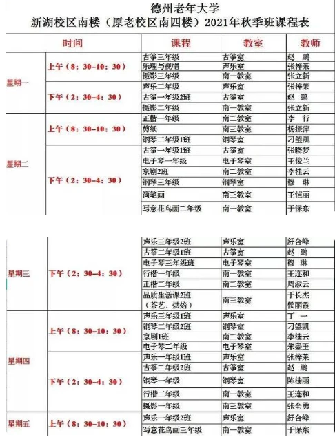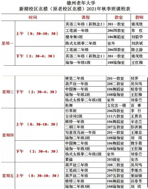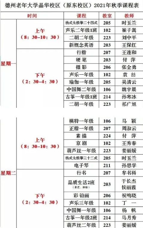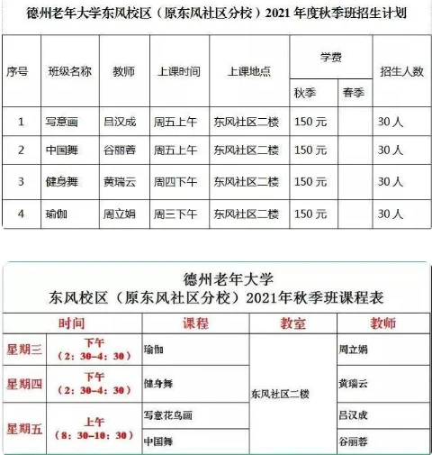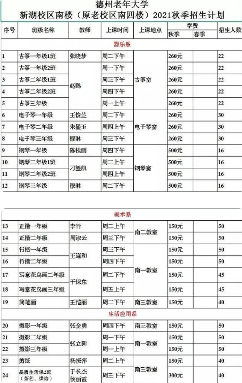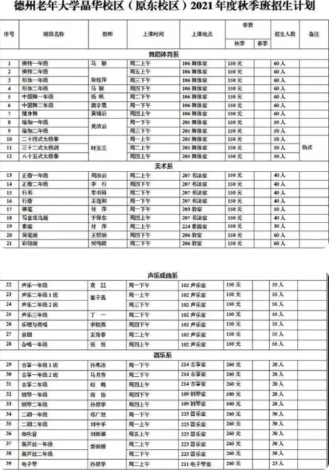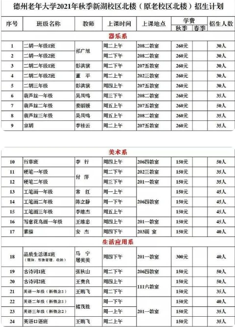 各班次均按《德州老年大学2021年度秋季班招生计划》(详见下表)招收学员,额满为止。每人不限报班次数量,报名截止后,报名人数不能满足开班条件的班次不予开班,由教务科统一调整到与所报专业同价位且名额不满的其他班次。