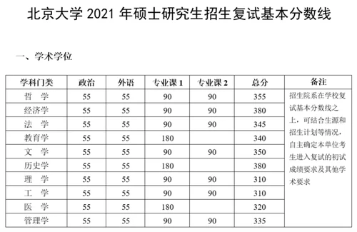 北京大学2021研究生考试学术硕士复试线情况如图所示。