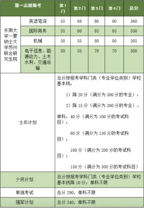 东南大学2021研究生考试专项计划硕士复试线情况如图所示。