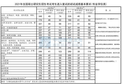 北京大学2021研究生考试专业硕士复试线情况如图所示。