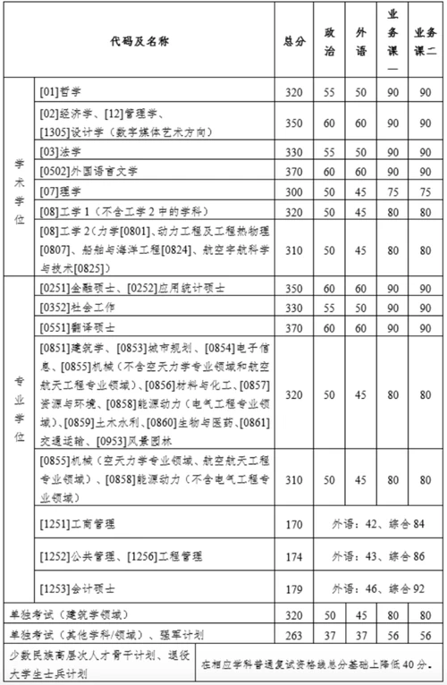北航2021研究生考试学术硕士、专业硕士、专项计划硕士复试线情况如图所示。