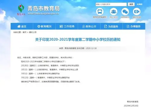 此前,青岛市教育局发布过2020-2021学年度第二学期中小学校历的通知