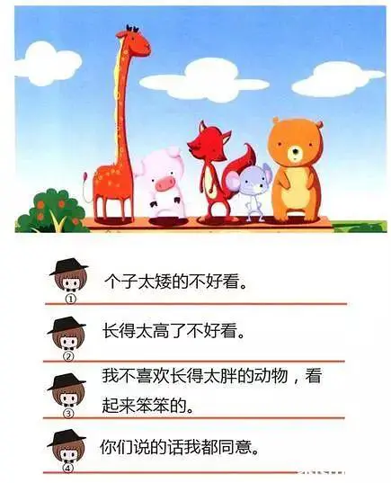 四位小朋友正在讨论自己喜欢的动物,你能根据他们的话,推断出图中的哪只小动物最受④号小朋友的喜欢吗?