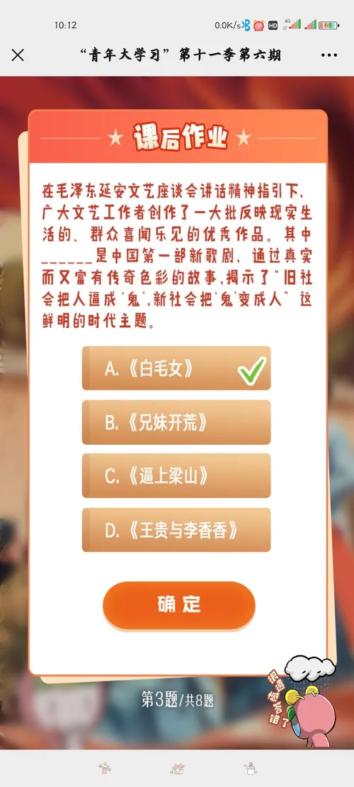 在毛泽东延安文艺座谈会讲话精神指引下,广大文艺工作者创作了-大批反映现实生活的、群众喜闻乐见的优秀作品。其中__是中国第一部新歌剧,通过真实而又富有传奇色彩的故事,揭示了“旧社会把人逼成‘鬼’,新社会把'鬼’变成人”这鲜明的时代主题。