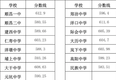 顺昌县高中录取最低控制分数线