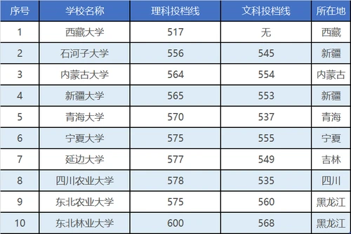 由上表可以得出,在四川省录取分数比较低的“985工程”大学为西北农林科技大学、兰州大学、西北工业大学、中央民族大学、中国海洋大学、中国农业大学等数所院校。