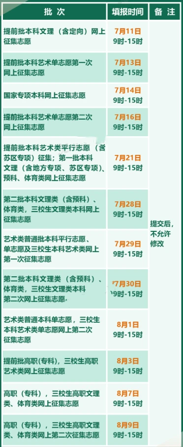提前批本科,先投军事类平行志愿,投完立即投非军事类单志愿;高校专项、综合评价录取、高水平艺术团、高水平运动队等在国家专项本科录取之后,第一批本科正式投档前完成投档录取(其中列入第二批本科高校招收高水平运动队的,在第二批本科正式投档前完成投档录取)。地方专项和苏区专项招生高校单设院校代号,与一本统招计划列为同一批次,投档时按考生志愿平行投档(苏区专项艺术类计划列入提前批本科),凡未进行资格审查或资格审查不合格的考生填报专项计划代号高校均为无效志愿。