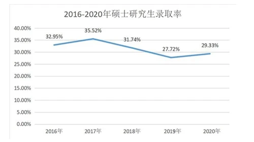 2016年-2019年研究生录取率是逐年下降的趋势。2020年研究生录取率29.33%高于了2019年的研究生录取率27.72%,是因为受疫情影响,2020年初教育部扩招18.9万硕士研究生名额。但是依旧低于2018年的31.74%。研究生的竞争激烈程度加剧是个不可逆的趋势。