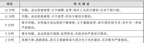 作文满分为 15 分,分为五个档次:14 分档 ( 13-15 分 ) 、11 分档 ( 10-12 分 ) 、8 分档 ( 7-9 分 ) 、5 分档 ( 4-6 分 ) 、2 分档 ( 1-3 分 ) 。