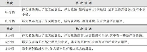 翻译满分为 15 分,成绩分为五个档次:13-15 分、10-12 分、7-9 分、4-6 分、1-3 分。