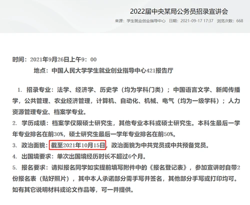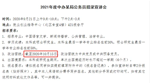 因为在2020年9月,中国人民大学就业创业指导中心也发布了中央某局2021年公务员招录宣讲会,具体招录要求与现在基本类似。大家尤其注意政治面貌也是:截至2020年10月15日,政治面貌为中共党员或中共预备党员。