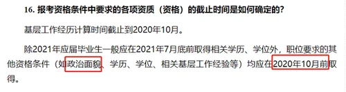 恰巧,2021年国考公告发布时间是在10月14日,报名时间为2020年10月15日开始至10月24日。与2021年国考报考指南中对职位要求的其他资格条件如政治面貌等要求是在2020年10月前取得有所不同,中央某局2021年公务员招录宣讲会的政治面貌要求截止时间具体到了”截至2021年10月15日“,今年也是如此。