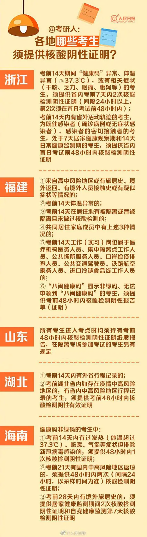 目前,多省份公布2022考研防疫要求:保持健康码、行程卡绿码,考前14天起非必要不流动、打卡或填写健康监测信息,特别是多省份提醒考研前48小时内做核酸,并提出具体要求。都有哪些地区的考生需要提供核酸阴性证明呢?下面是可圈可点网小编整理的相关信息,一起来看看吧!祝大家考试顺利!