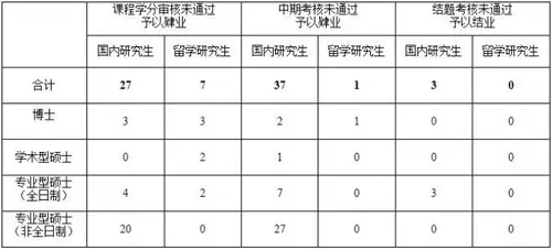 2021年,学校就不同年级在校研究生的课程学习、选题开题、实践及结题等环节进行学分审核、中期考核、结题考核,对预警后在规定时间内仍未通过考核审核的,经各学院学位评定分委员会审议、学院网站公示,共有国内研究生67人、留学研究生32人未通过培养环节的审核或考核。经校学位评定委员会审定,对67名国内研究生,8名留学研究生做出终止学业,予以肄业、结业决议。对24名因疫情影响无法返校的留学研究生同意暂缓审核考核的决议。