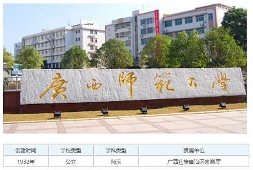 广西师范大学是重点大学,坐落在桂林市。学校有王城、育才、雁山3个校区,校园面积4100多亩。学校现有22个教学学院(含独立学院——漓江学院),在职教职员工2222人,全日制本科生23330人,硕士生5899人,博士生137人,各类留学生1600多人,函授、业余等学员近14000人。