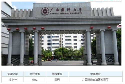 广西医科大学创建于1934年11月21日,坐落在广西南宁市,校本部占地面积71万多平方米。前身是广西省立医学院。学校是全国建校较早的22所医学院校之一。2008年,学校获教育部本科教学工作水平评估优秀成绩。2011年,作为国家正式实施医学专业认证后的第一所医学院校通过了教育部临床医学专业认证、全国第三所大学接受并通过了护理学专业试点认证。