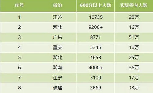 从600分以上的人数来看,江苏省有10735人上线,在联考的省份里面排名第一。而河北省则是有9200+名学生,在排名第二,紧跟在江苏省的后面。