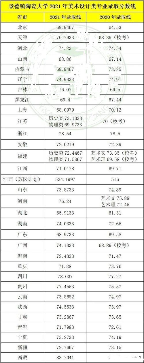景德镇陶瓷大学艺术生美术类分数线2021,景德镇陶瓷大学2021年美术类招生分数线,连续两年因为特殊情况,景德镇陶瓷大学取消了美术类校考,采用各省美术统考成绩,按照学校的录取规则进行录取。那么今年的录取分数线是多少芬呢?下面是小编整理的相关信息,一起来看看吧。