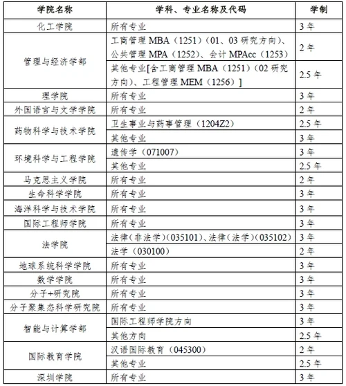 除上表所列学院及专业外,其他学院的所有专业学制均为2.5年。新生入学后双向选择指导教师。