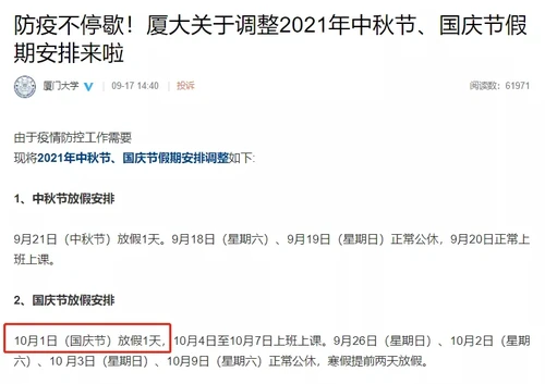 9月17日,厦门大学官微发布假期安排:10月1日(国庆节)放假1天,10月4日至10月7日上班上课。9月26日(星期日)、10月2日(星期六)、10 月3日(星期日)、10月9日(星期六)正常公休,寒假提前两天放假。