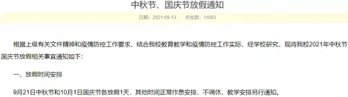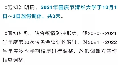 为统筹做好2021年教育系统疫情防控工作,7月2日,教育部就印发了通知。通知强调,各地教育部门和高校要分类落实常态化疫情防控措施,大学则按照教育部安排自行确定放假时间,因此在这个即将来临的国庆节,各所高校的放假安排也不尽相同: