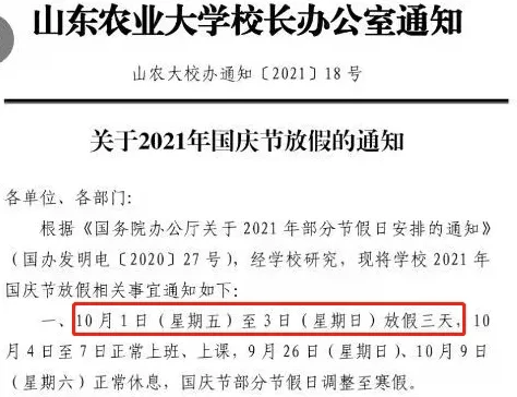 近期,山东农业大学校长办公室通知:国庆节放假时间为10月1日至3日,放假3天。