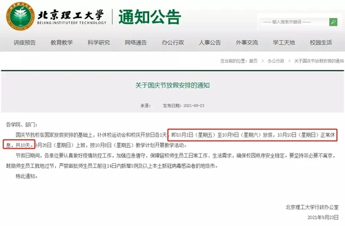 9月23日,该校发布“关于国庆节放假安排的通知”指出,国庆节我校在国家放假安排的基础上,补休校运动会和校庆开放日各1天,即10月1日(星期五)至10月9日(星期六)放假,10月10日(星期日)正常休息,共10天。9月26日(星期日)上班,按10月8日(星期五)教学计划开展教学活动。