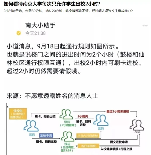 据悉,南京大学疑似自9月18日施行新的通信规则:校门之间的进出时间为2个小时(鼓楼和仙林两个校区通行权限互通),出校2小时内可刷卡进校,超过2小时仍然需要请假。