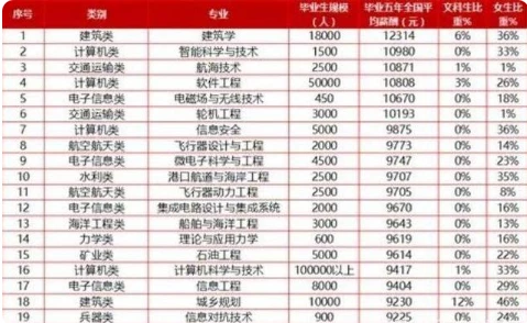 在排名表中我们能清楚地看到,建筑学专业高居榜首,大多数毕业5年的毕业生,平均薪资可达1.2W万,这个数据高居榜首是无疑的。建筑类专业非常适合男生报考,可谓是把机会送到男生手中。