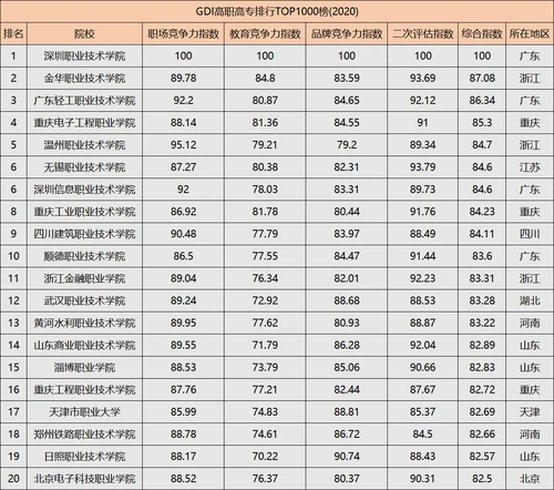 当然,这10所“双一流”A档院校的实力都相当不错,相信其他6所高职院校的就业率也不会差。根据2020年广州日报数据和数字化研究院(GDI智库)联合发布的“GDI高职高专排行TOP1000榜”,以上10所高职院校的职场竞争指数也都不错。