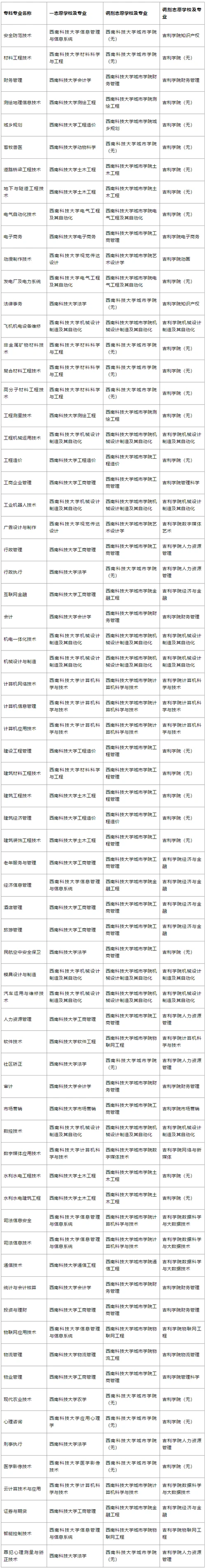 第四条 西南科技大学(以下简称“我校”)与西南科技大学城市学院以及吉利学院(以下简称“调剂志愿学校”)联合开展2021年专升本工作,联合协议报省教育厅备案。
